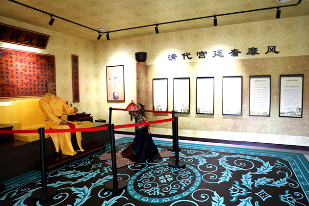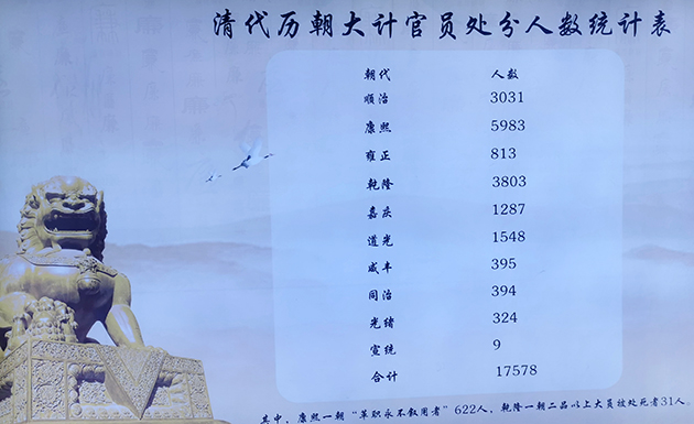 圓明園廉政文化基地以“廉興腐衰鑒圓明”為主題,分為澄心堂、師善堂、慎德堂、益思堂四個展廳,最引人注目的是“清代歷朝大計官員處分人數統計表”,從順治到宣統年間被處分的官員多達17578 人。其中,康熙一朝“革職永不敘用者”622 人,乾隆一朝“二品以上大員”被處死者31 人。
