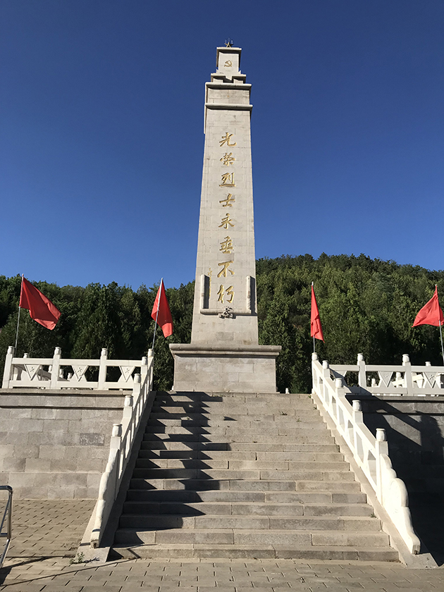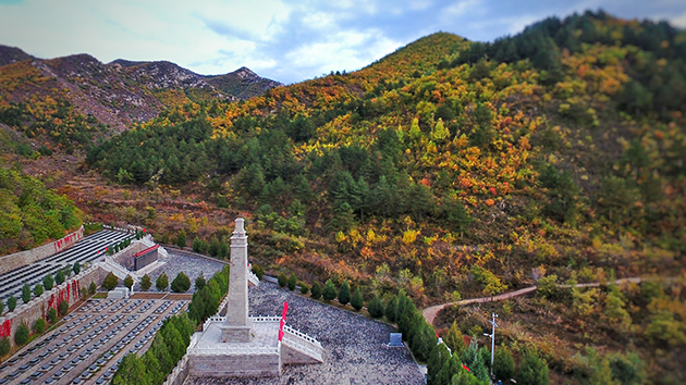 這座紀念碑是陵園的主體建筑之一,碑身面積152.8 平方米,高14.8 米,碑身用596 塊花崗巖石塊砌治而成,碑身正面鐫刻著聶榮臻元帥的題詞“光榮烈士永垂不朽”,碑身背面鐫刻著段蘇權將軍的題詞“英雄的戰士,堅強的人民,他們的不朽業績永垂不朽”。紀念碑高大雄偉,站在數百米外就可以瞻仰它的雄姿,青山相依,綠水為伴,象征著革命烈士的革命精神,代代相傳,萬古流芳!